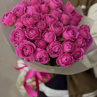Потрясающий букет из пионовидных и кустовых роз, гвоздик, гортензий, орхидей, озотамнуса и аспарагуса, с добавлением папоротника и гиперикума в стильной упаковке
